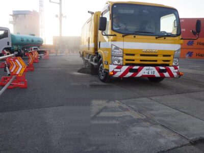 清水港のコンテナヤードの清掃を行いました。工事の後の埃を清掃車で清掃しました。さうが清掃車、あっという間にきれいになりました。