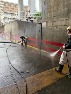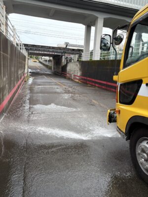 大雨などでどうしても汚れてしまうアンダーパス。高圧洗浄車で丁寧に洗い汚れた汚水をバキューム車で吸引しながら洗います。乾いたらスイーパーで清掃。ピカピカにします。