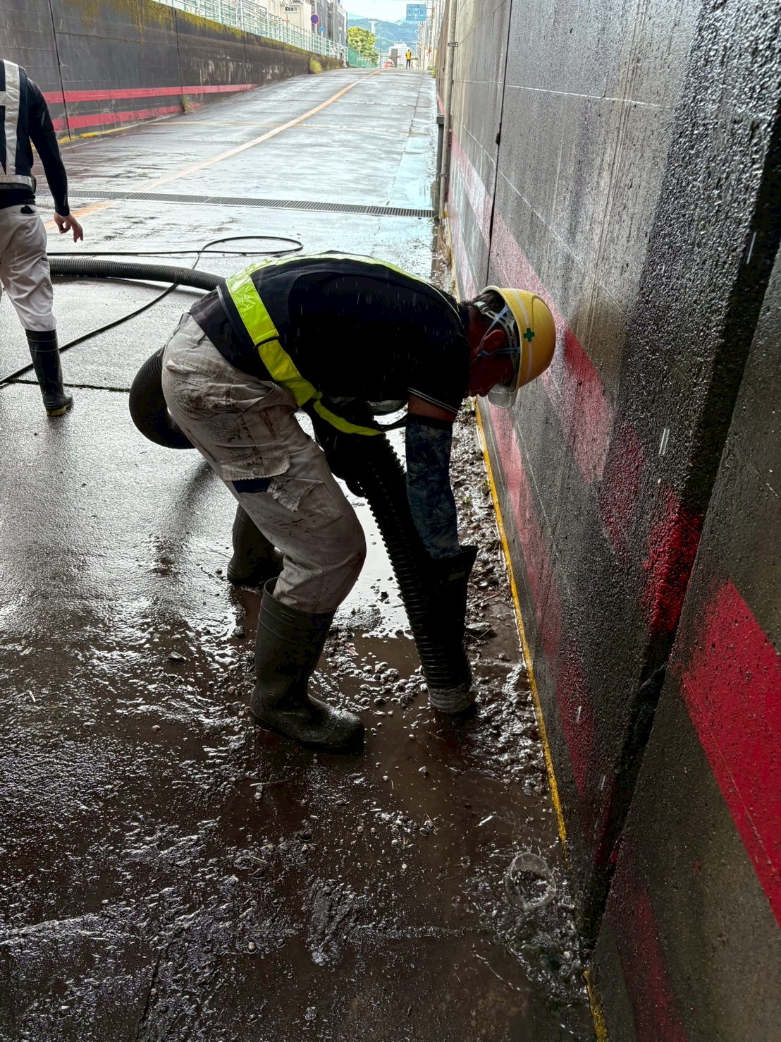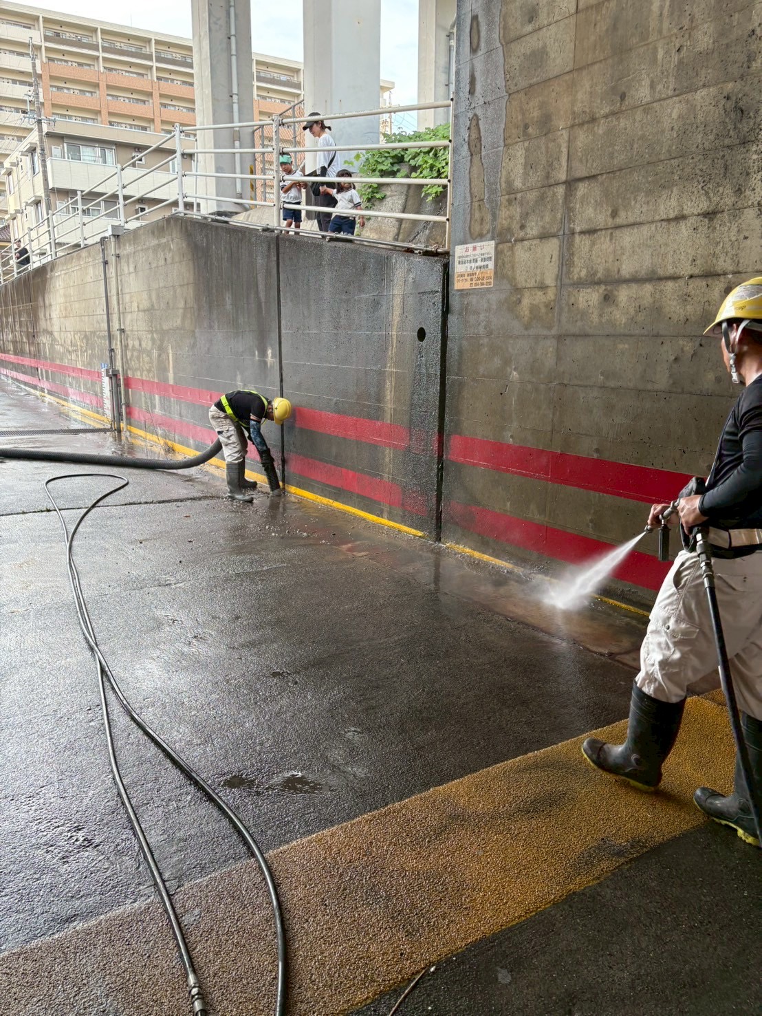 2025の大雨後の道路清掃に出動。高圧洗浄車、散水車のほか職員10名ほど出動しました。道路を利用される方に一刻も早く通っていただくため迅速な対応を求められました。