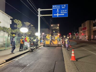 国道の夜間工事で舗装のうち替えを行なっています。1車線を切削してその日のうちに舗装して朝5時までに開放する工事です。