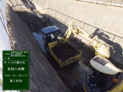 雨季前に予め小断面の河川の浚渫工事です。小規模な河川は水の流れを止めることが困難なため工夫しながらの施工が必要です。搬出土砂の水分を少なく運搬できるように配慮しながらの工事です。