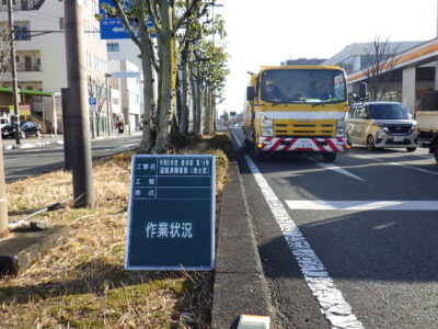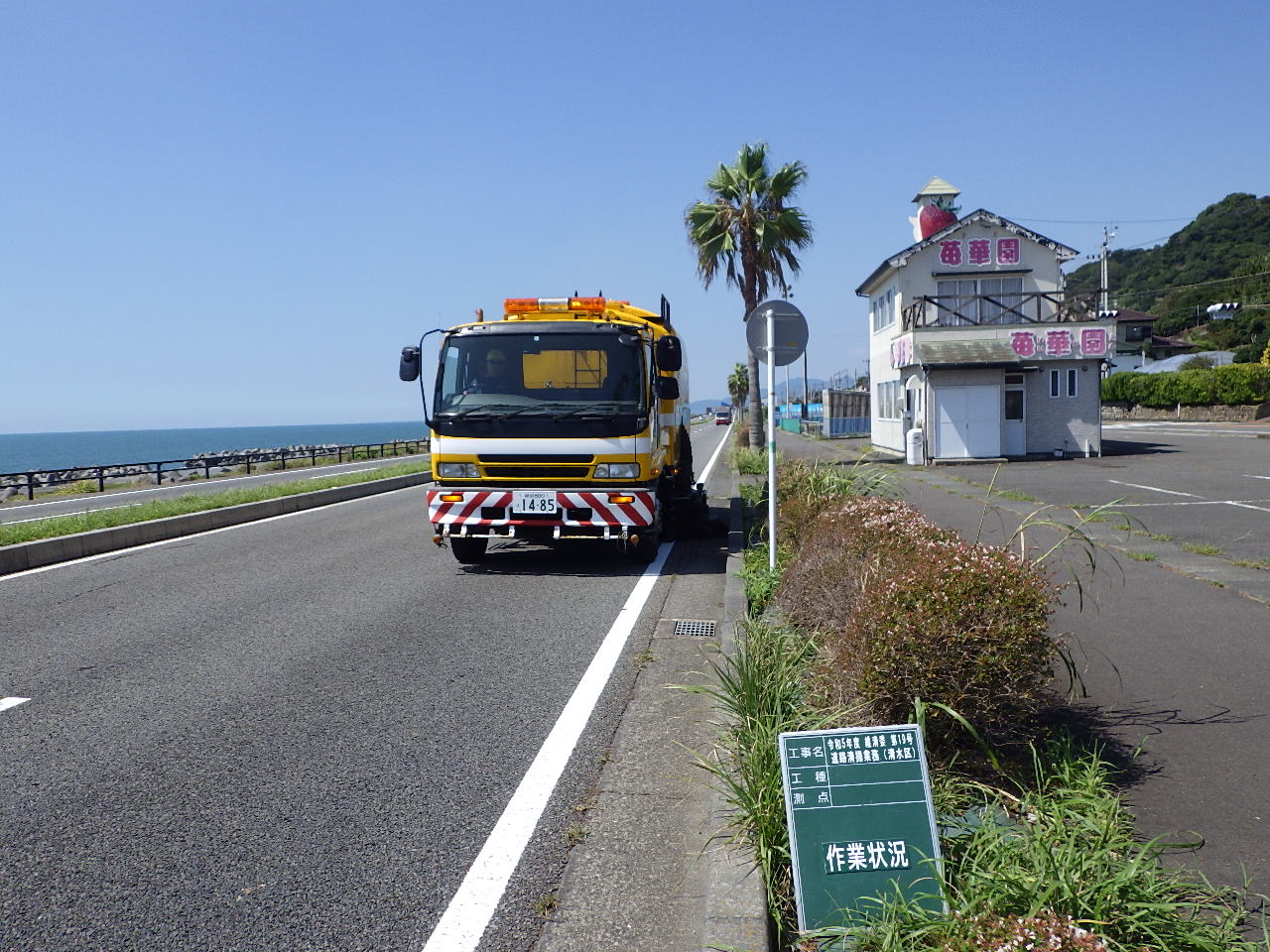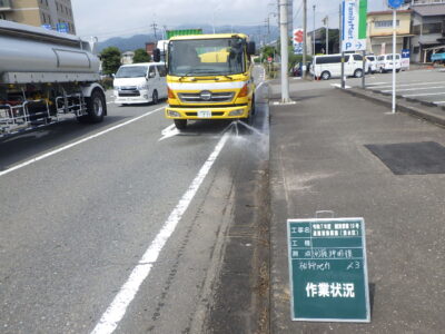 国道150号線の道路清掃です。大型車両による清掃です。きれいで気持ちの良い環境つくりに頑張っています。
