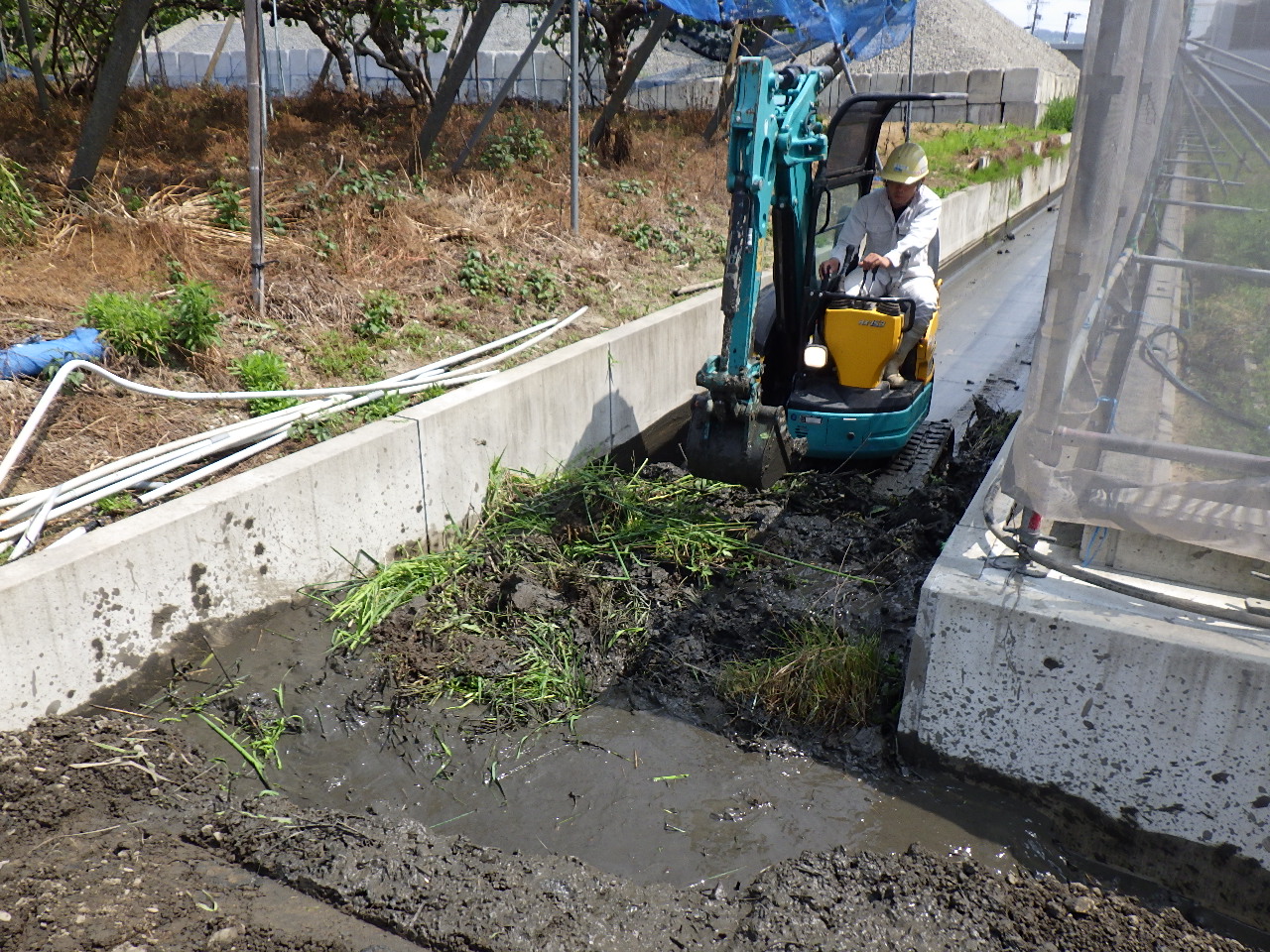 小規模水路の浚渫工事です。雨季前に対策して、大雨の時などスムーズな排水を確保します。事前の対策が重要です。小型重機を多用して機動力を生かした工事です。